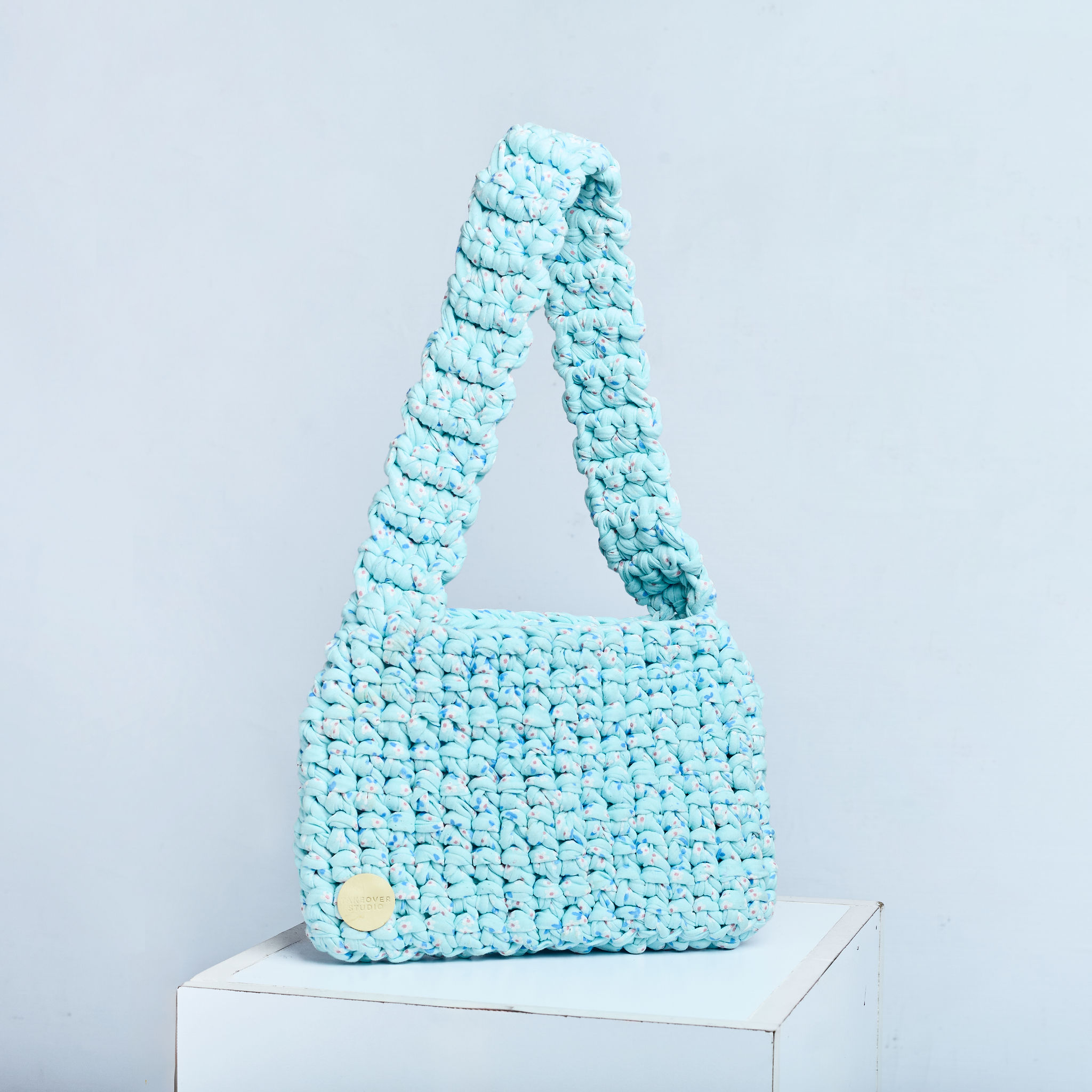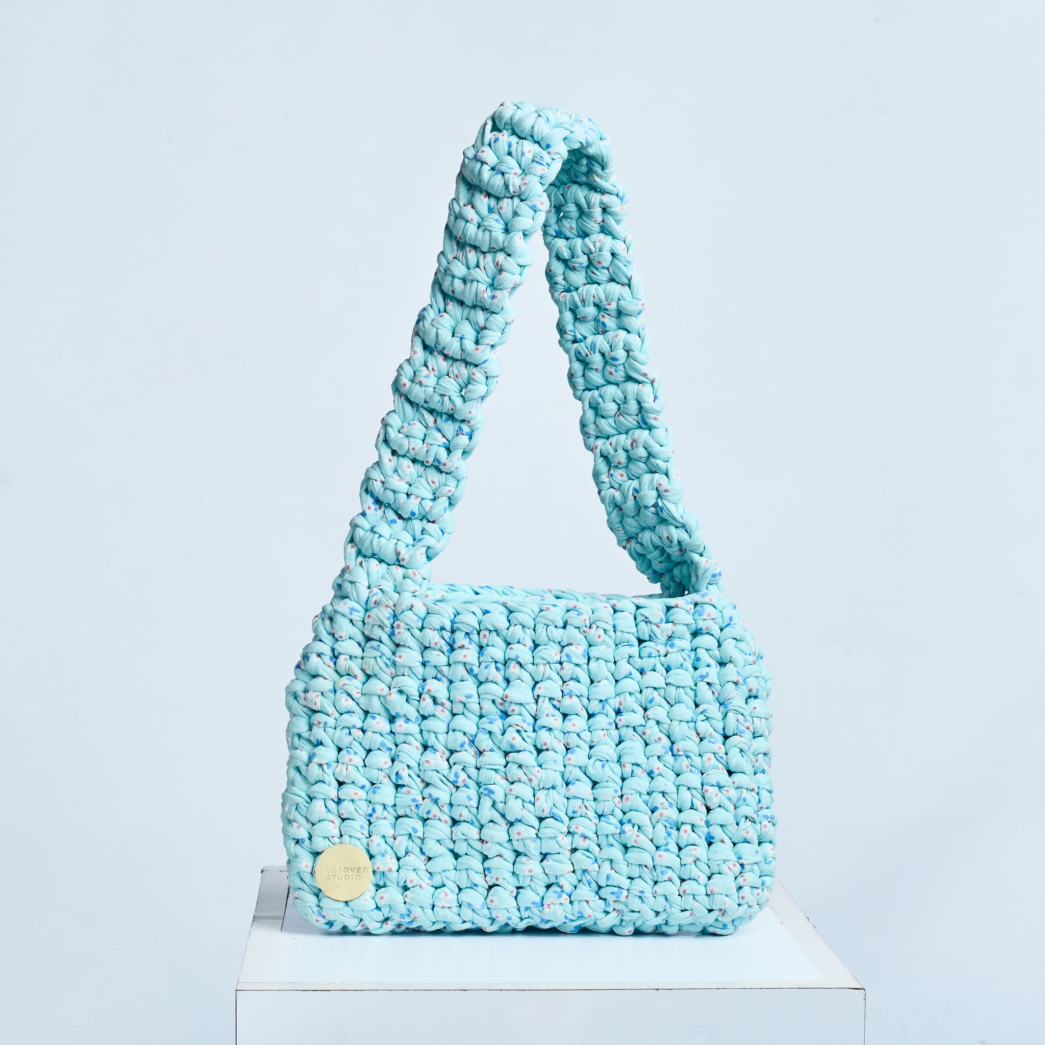 Fresh blue eco-friendly handbag made from recycled cotton yarn, blending everyday function with sustainable style.